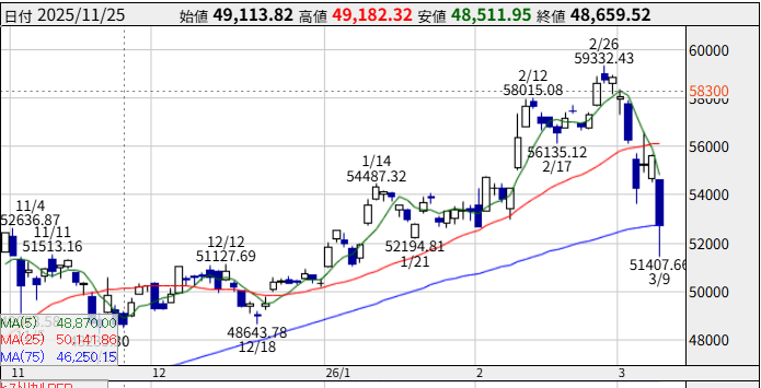 2026/3/9日経平均は、土日の日経先物の下落を上回る4000円の下落をみせました。後場買い戻されて2892円の(-5.02%)の下落となりました。