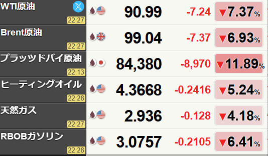 ↓WTI原油は一時100超えでしたが、G7の石油備蓄放出などで少し下げています。