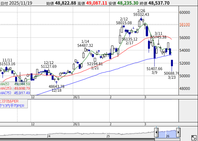 トランプ大統領の「48時間以内にホルムズ海峡を開放しないと電力インフラを破壊する」との発言で日本市場は大暴落。3/23に安値50688円を付けました。